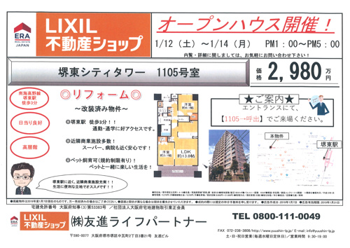 LIXIL不動産ショップ ERA 友進ライフパートナー > LIXIL不動産ショップ 友進ライフパートナーのスタッフブログ記事一覧 > 堺東シティタワー オープンハウスのお知らせ
